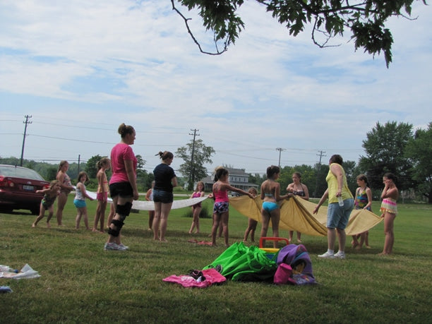 Is it hot at your summer camp? We placed water buckets around the camping area and had everyone wear bathing suits all day. Then in between activities we let the girls dump cups of water on their heads to stay cooled off.